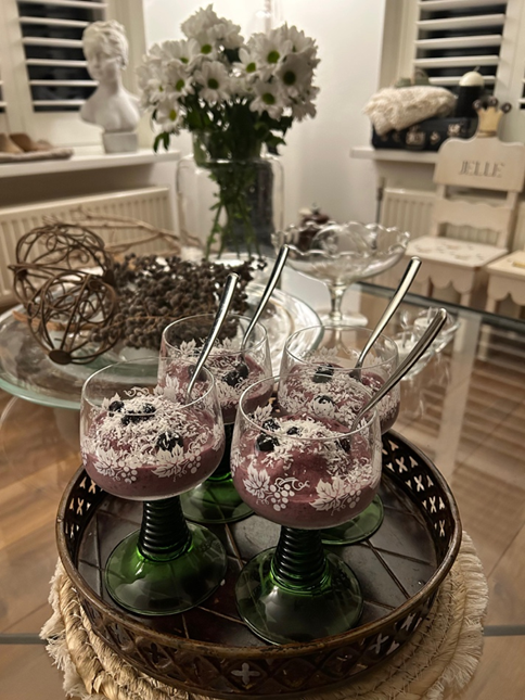 - Verdeel de ice cream vervolgens over mooie glaasjes en versier het vervolgens met de kokosvlokken en de besjes.
